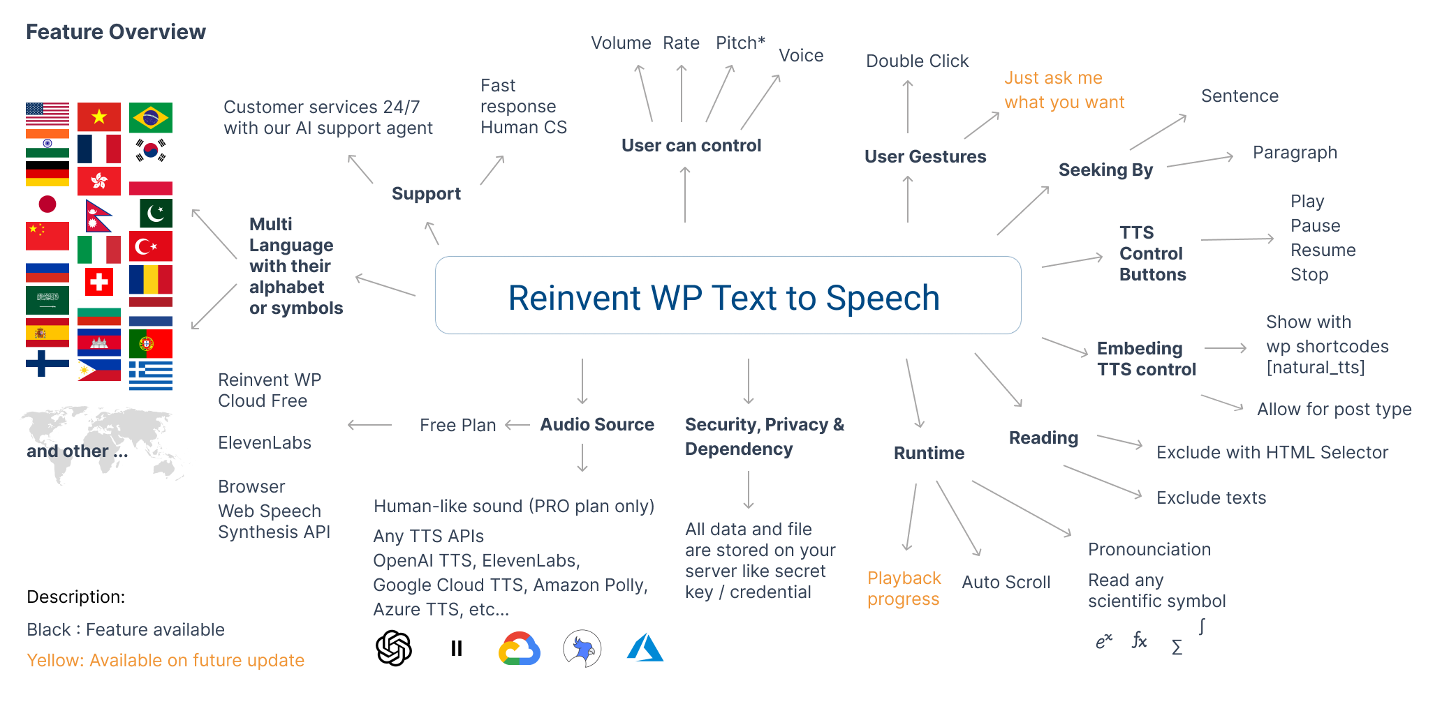 We support a wide range of languages and voices because this plugin acts as a bridge, connecting to multiple text-to-speech (TTS) cloud API providers such as OpenAI TTS, ElevenLabs, Google Cloud TTS, Amazon Polly, and Microsoft Azure.